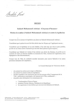 The town council of Vénissieux, a municipality in the suburbs of Lyon (France), decided to make Sakineh Ashtiani an honorary citizen of Vénissieux.